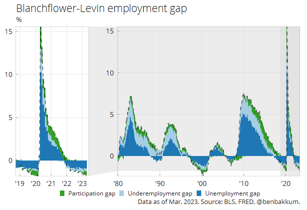An aggregate measure of labor market conditions, the Blanchflower-Levin employment gap, shows that there is essentially no more slack left in the labor market. It’s important to note however, that the participation gap shown here is based on the overall participation rate.