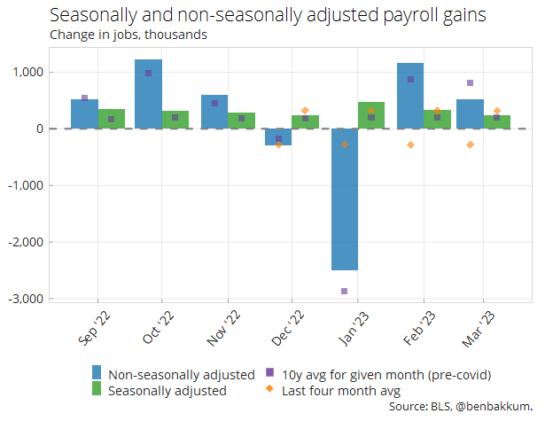 On a non-seasonally adjusted basis, the net number of payrolls added in March is below the pre-covid average of the last ten Marches. On a seasonally adjusted basis, March job gains were about in line with the average based on longer-term history.